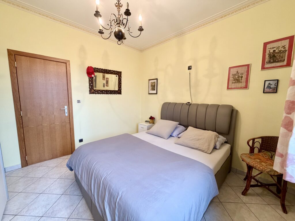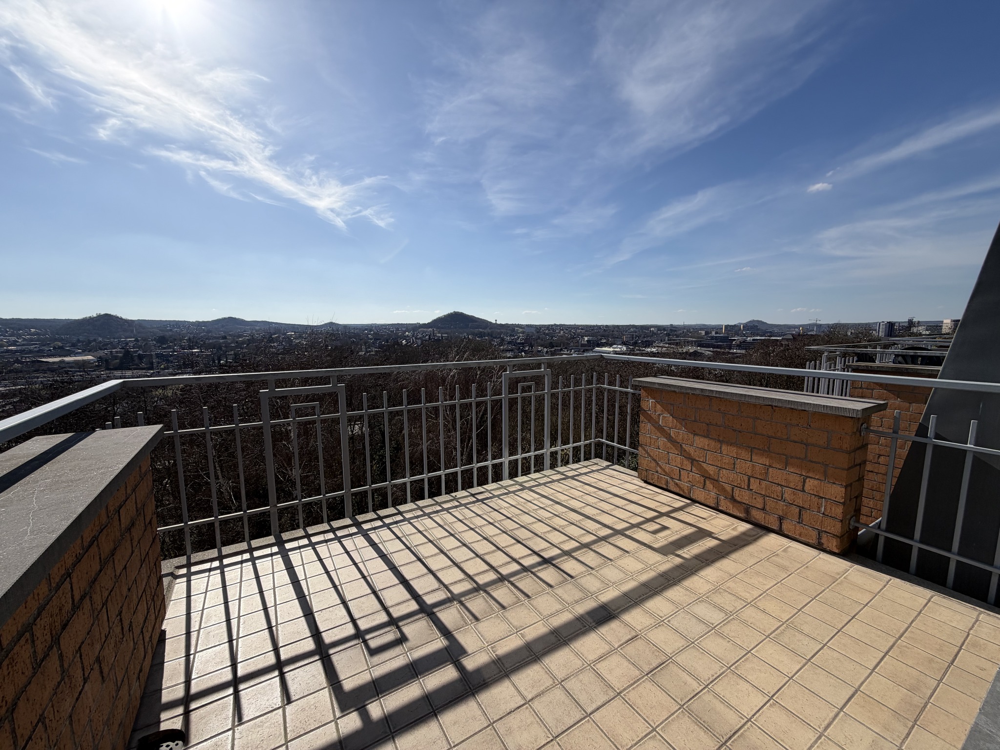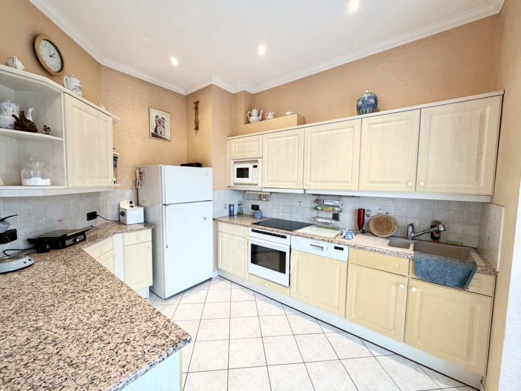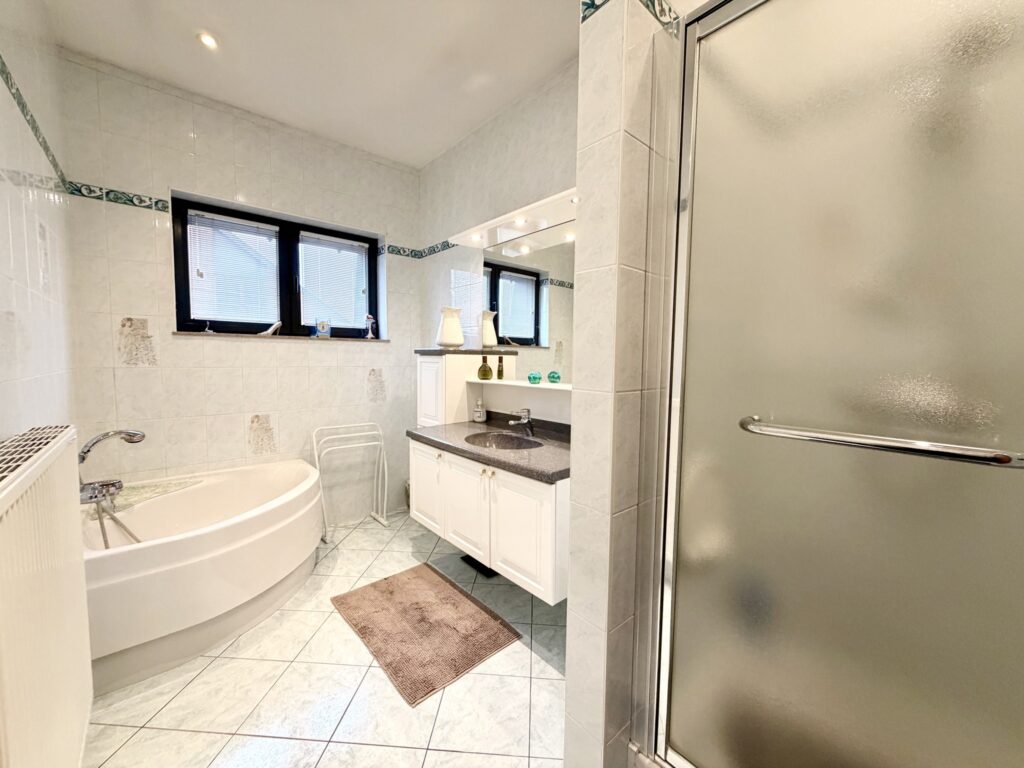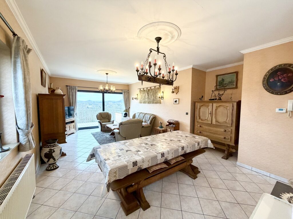 Hall d’entrée, séjour ouvert, cuisine équipée, débarras, buanderie, WC séparé, 2 chambres, salle de bain (baignoire, douche, lavabo), balcon, cave, garage, châssis double vitrage, chauffage central au gaz de ville, 114 m² de superficie plancher chauffée d’après PEB, 260 € de charges, situé au dernier étage.