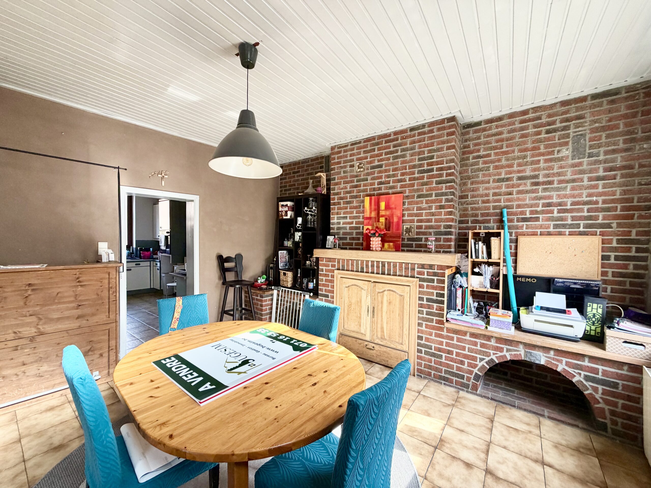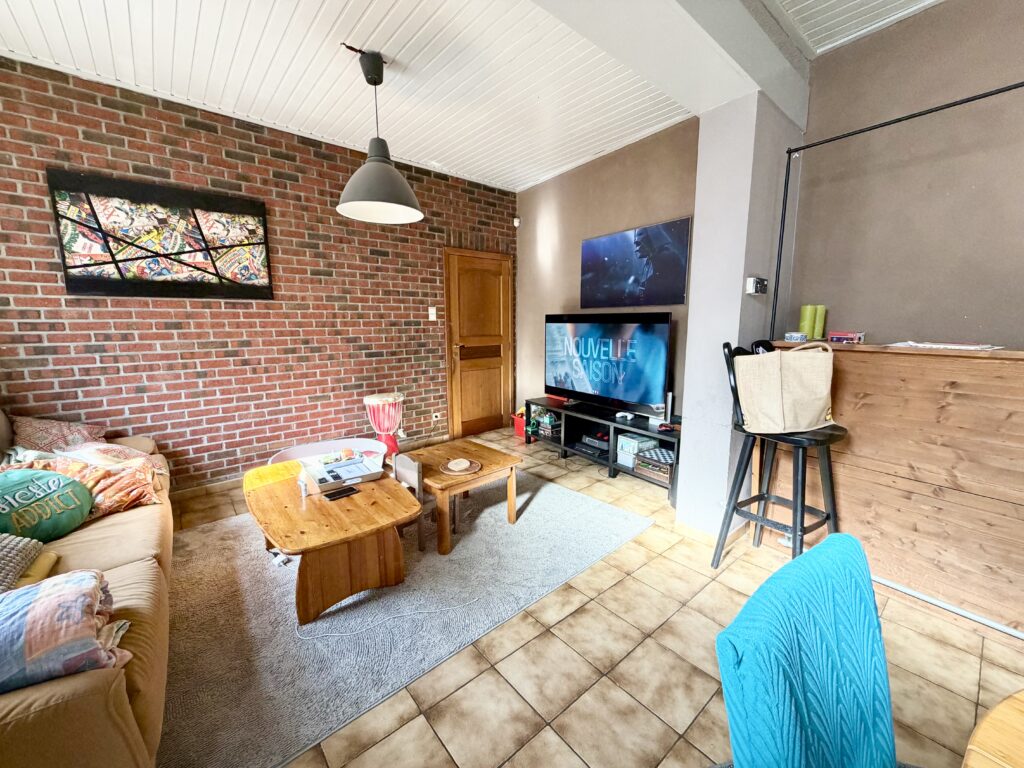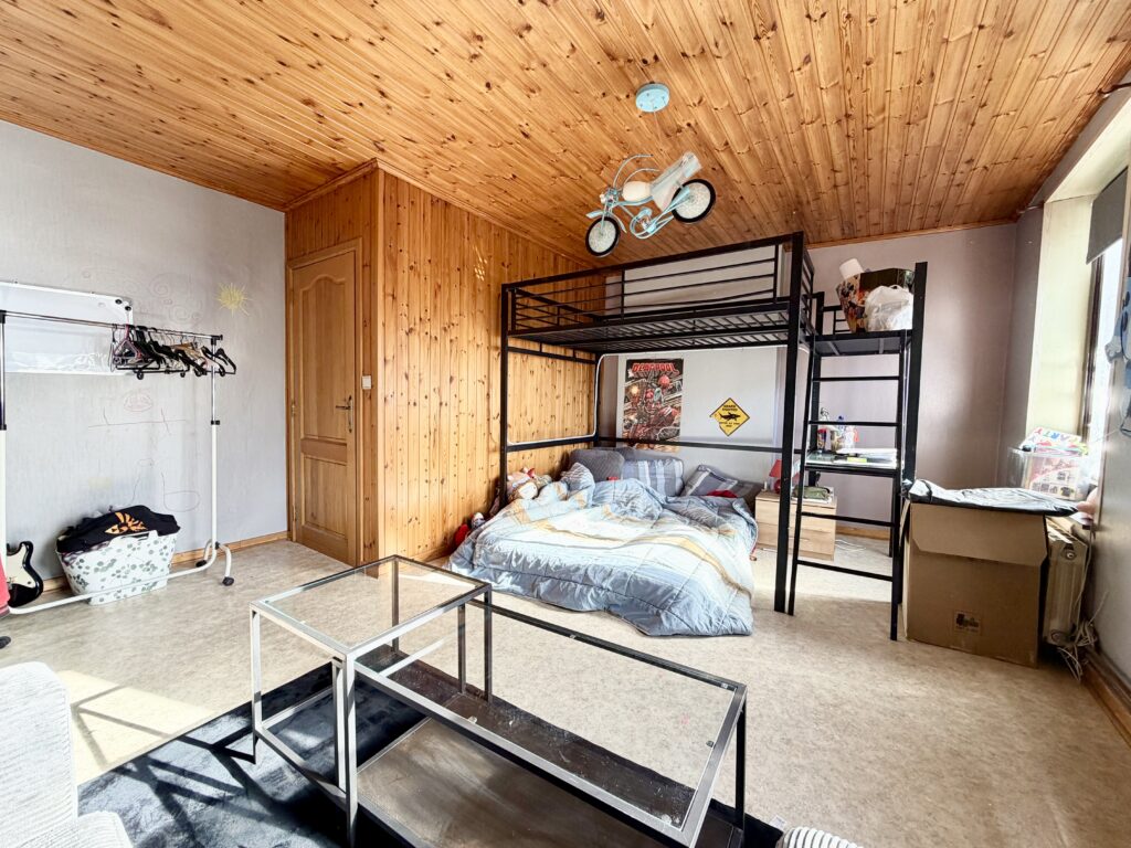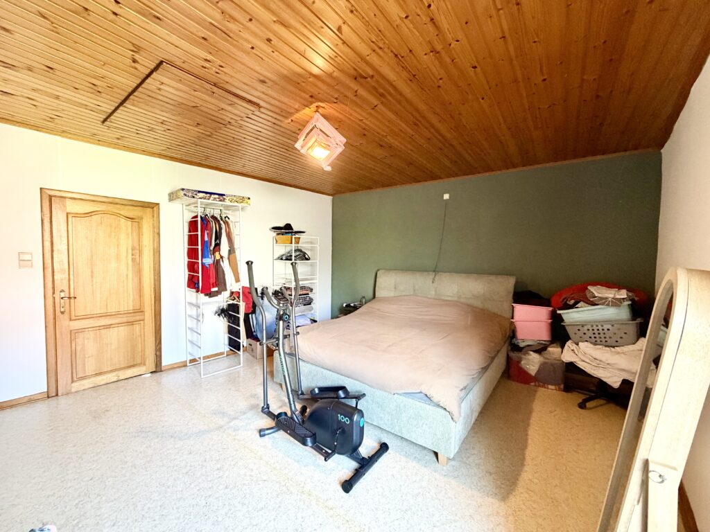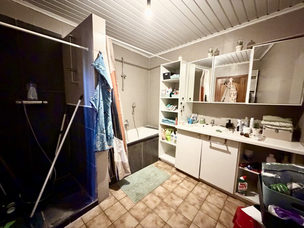 Séjour ouvert, coin cuisine, espace buanderie, WC séparé, salle de bain (douche, baignoire, lavabo, WC séparé), hall de nuit, 3 chambres, grenier entièrement aménageable, cave, terrasse, jardin, garage (accessible par la rue à l’arrière de la maison), atelier, châssis double vitrage bois, chauffage central au mazout, feu ouvert, 114 m² de superficie plancher chauffée d’après PEB.