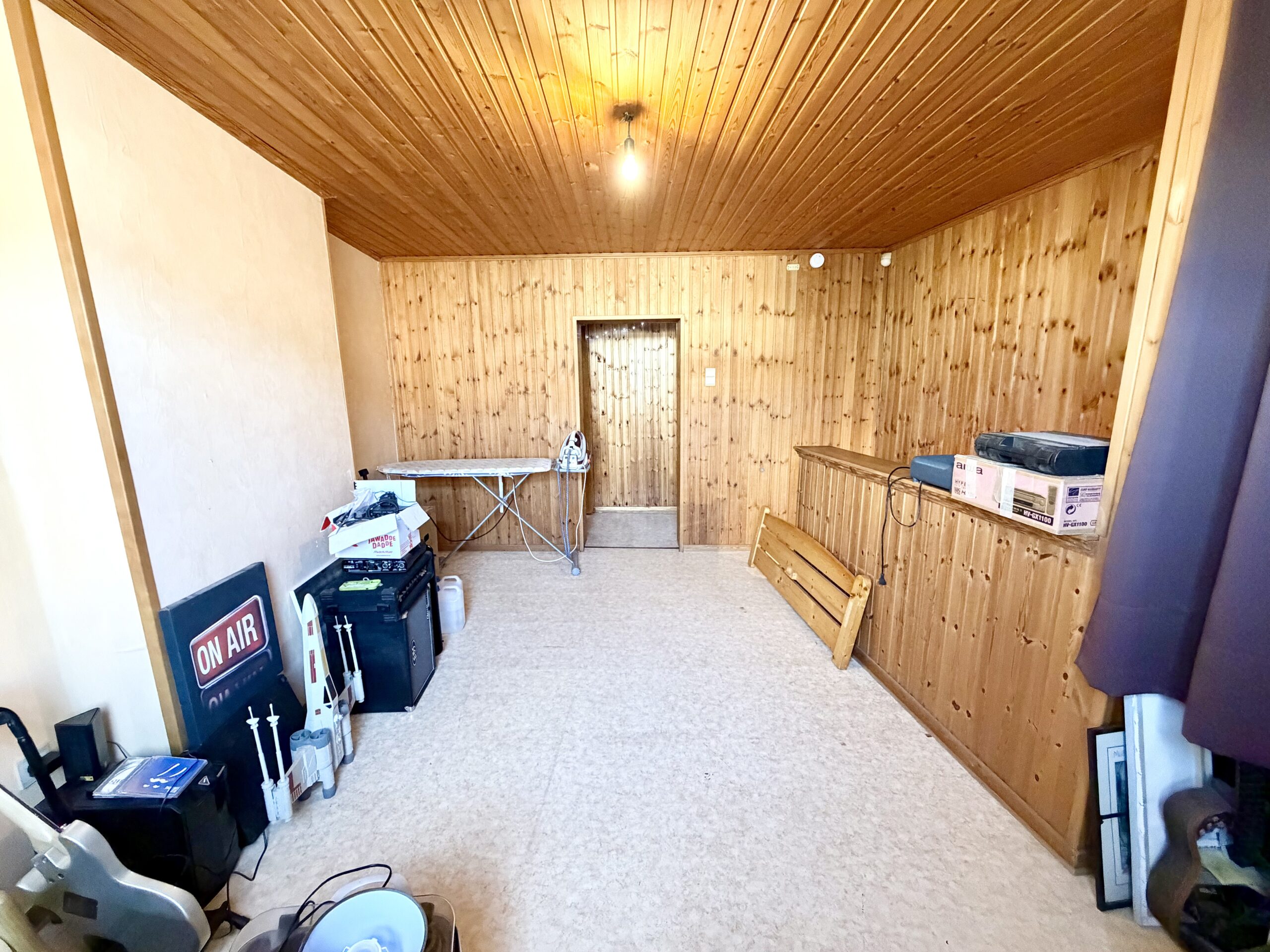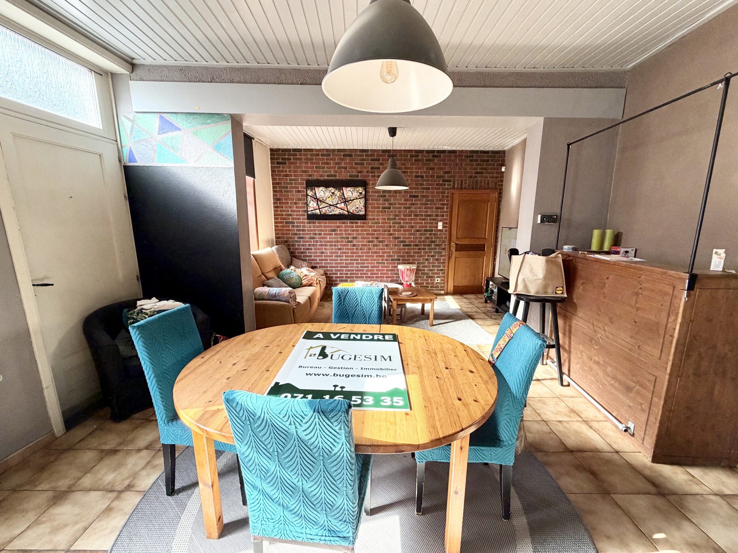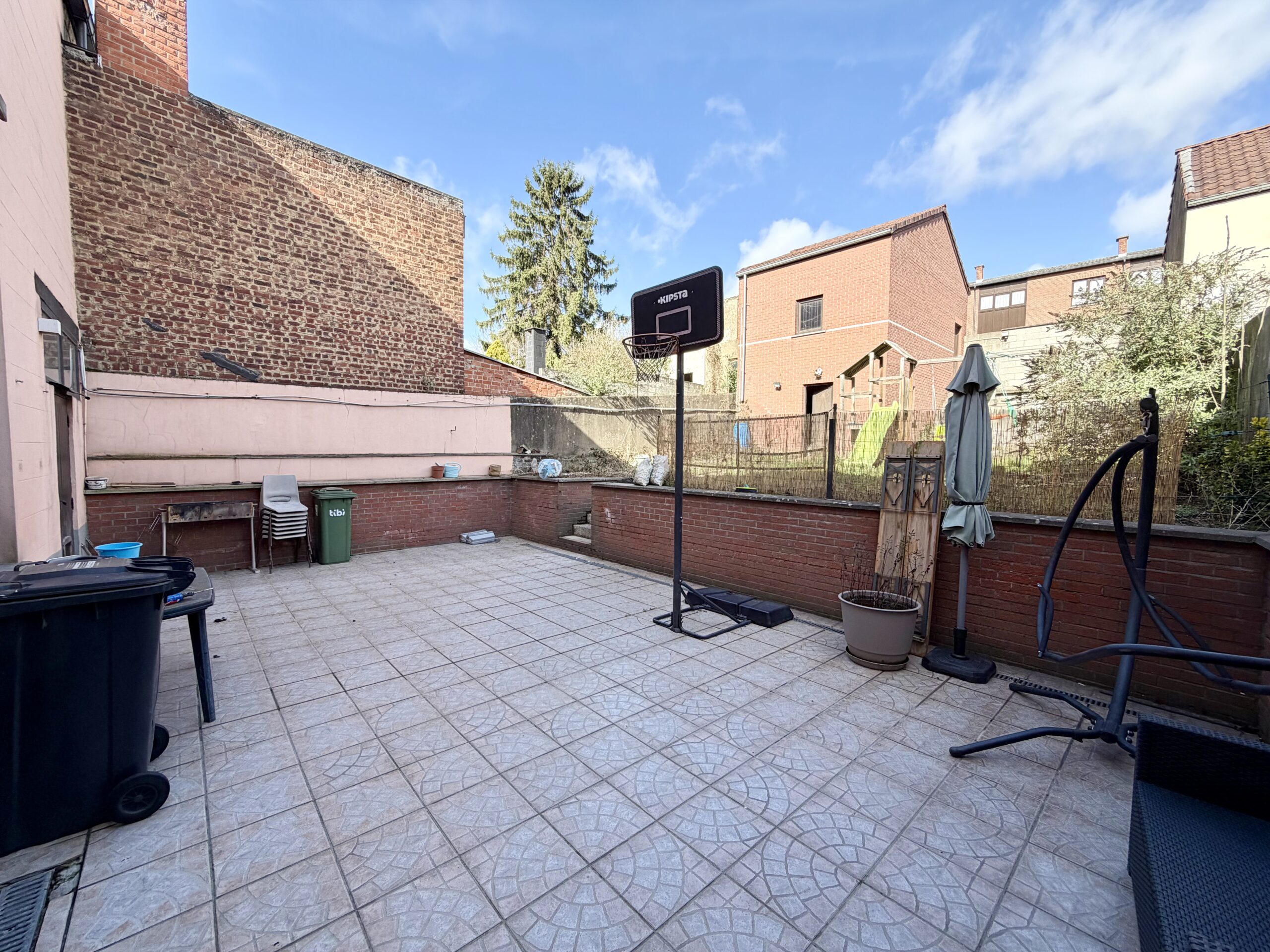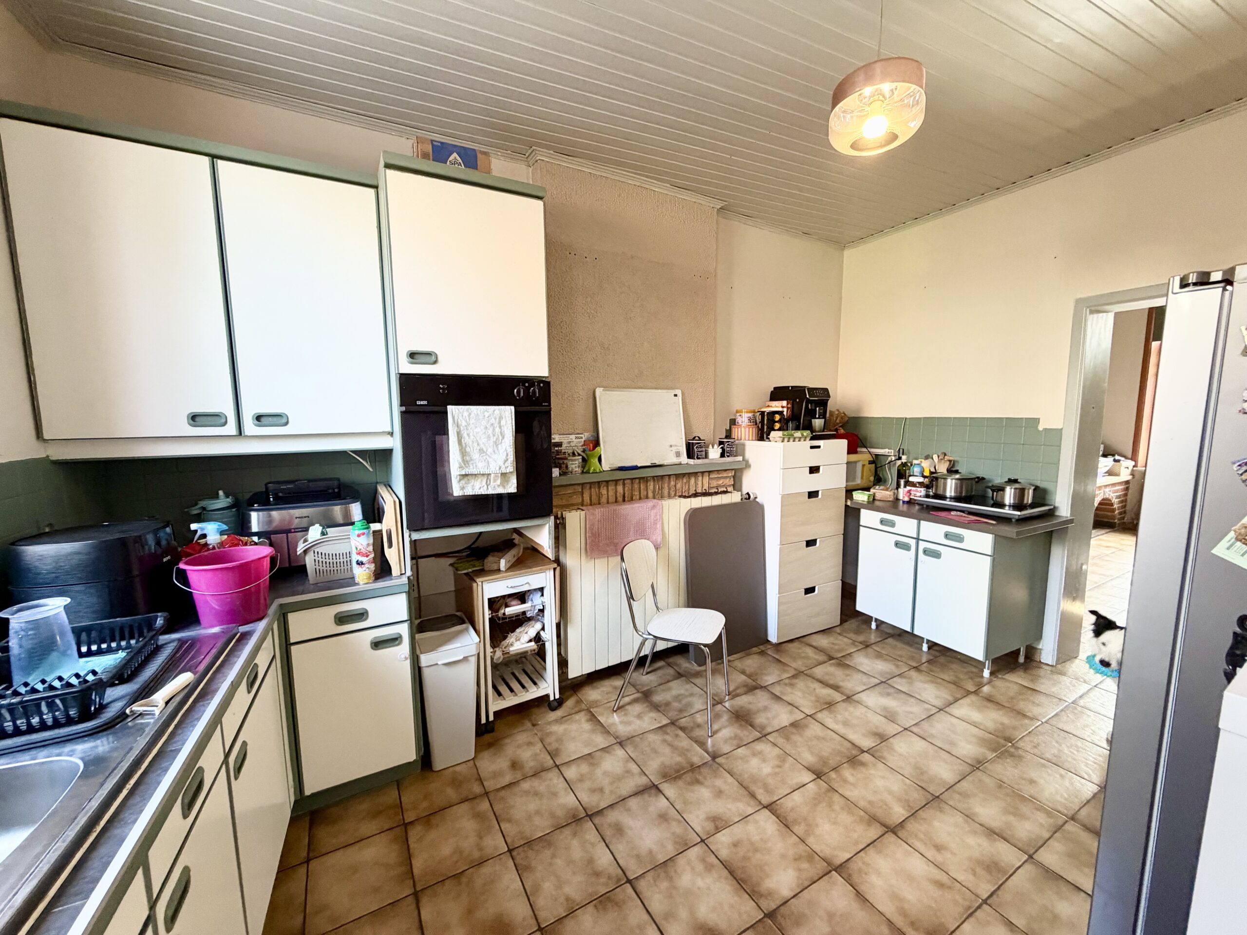 Séjour ouvert, coin cuisine, espace buanderie, WC séparé, salle de bain (douche, baignoire, lavabo, WC séparé), hall de nuit, 3 chambres, grenier entièrement aménageable, cave, terrasse, jardin, garage (accessible par la rue à l’arrière de la maison), atelier, châssis double vitrage bois, chauffage central au mazout, feu ouvert, 114 m² de superficie plancher chauffée d’après PEB.