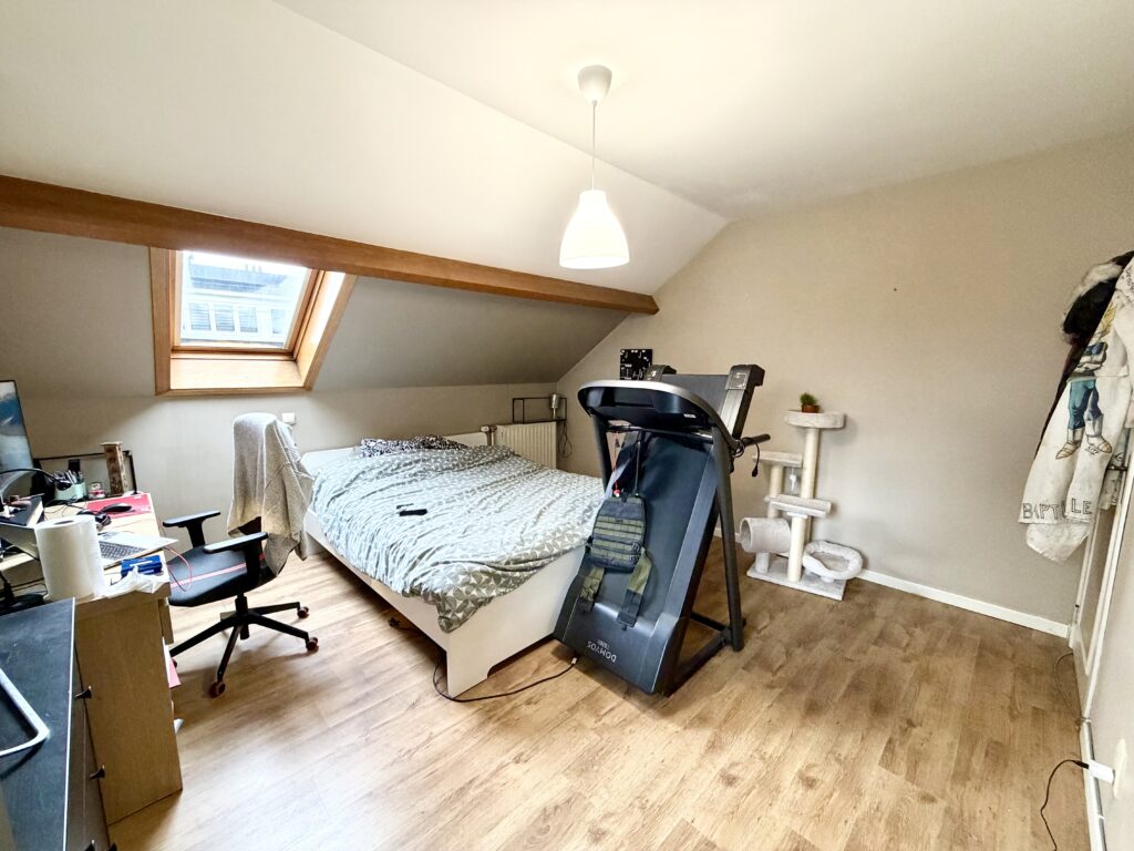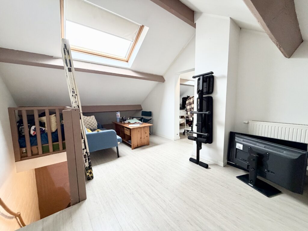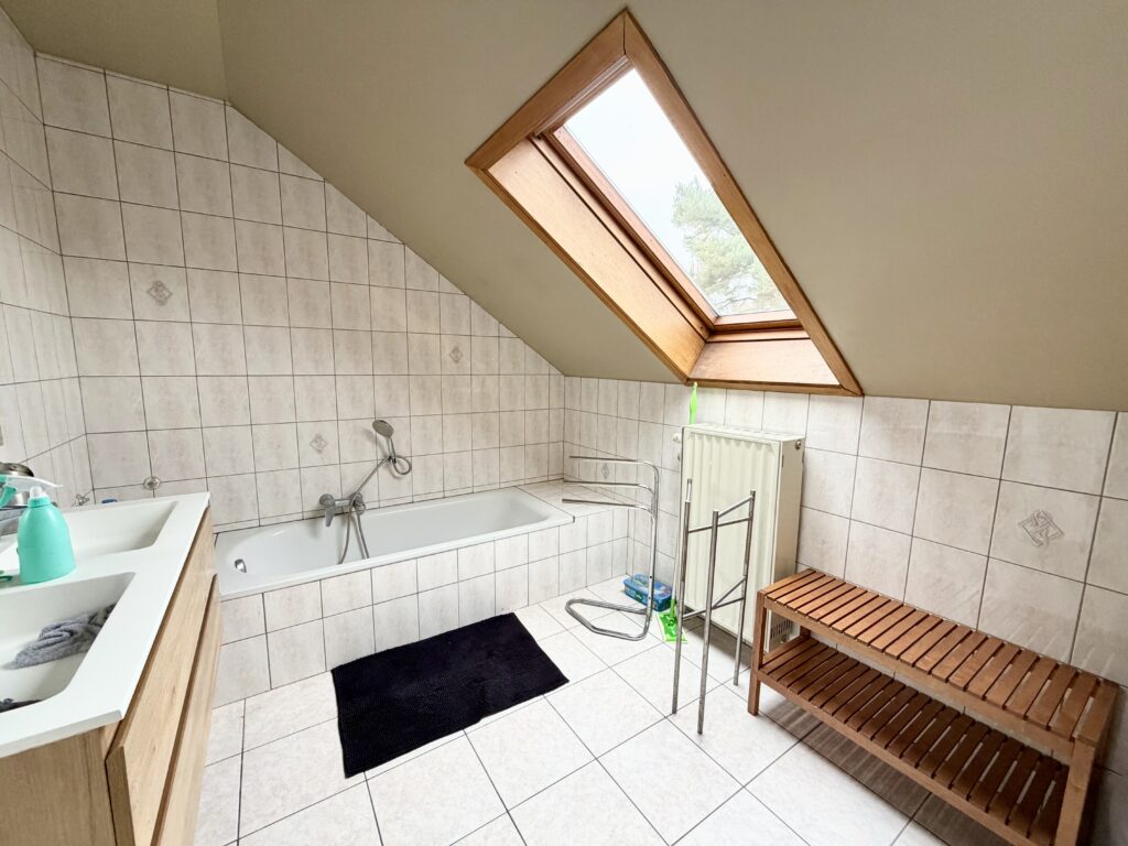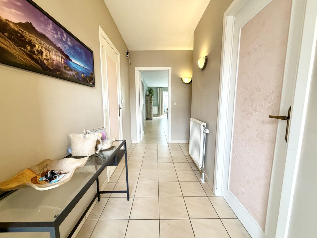 Hall d’entrée, bureau, WC séparé, salon, salle à manger, cuisine équipée, buanderie avec douche, garage, hall de nuit, 4 chambres, terrasse + jardin, passage latéral, châssis double vitrage PVC, chauffage central aux gaz de ville, panneaux photovoltaïques (21), 240 m² de superficie plancher chauffé d’après PEB, bail en cours.