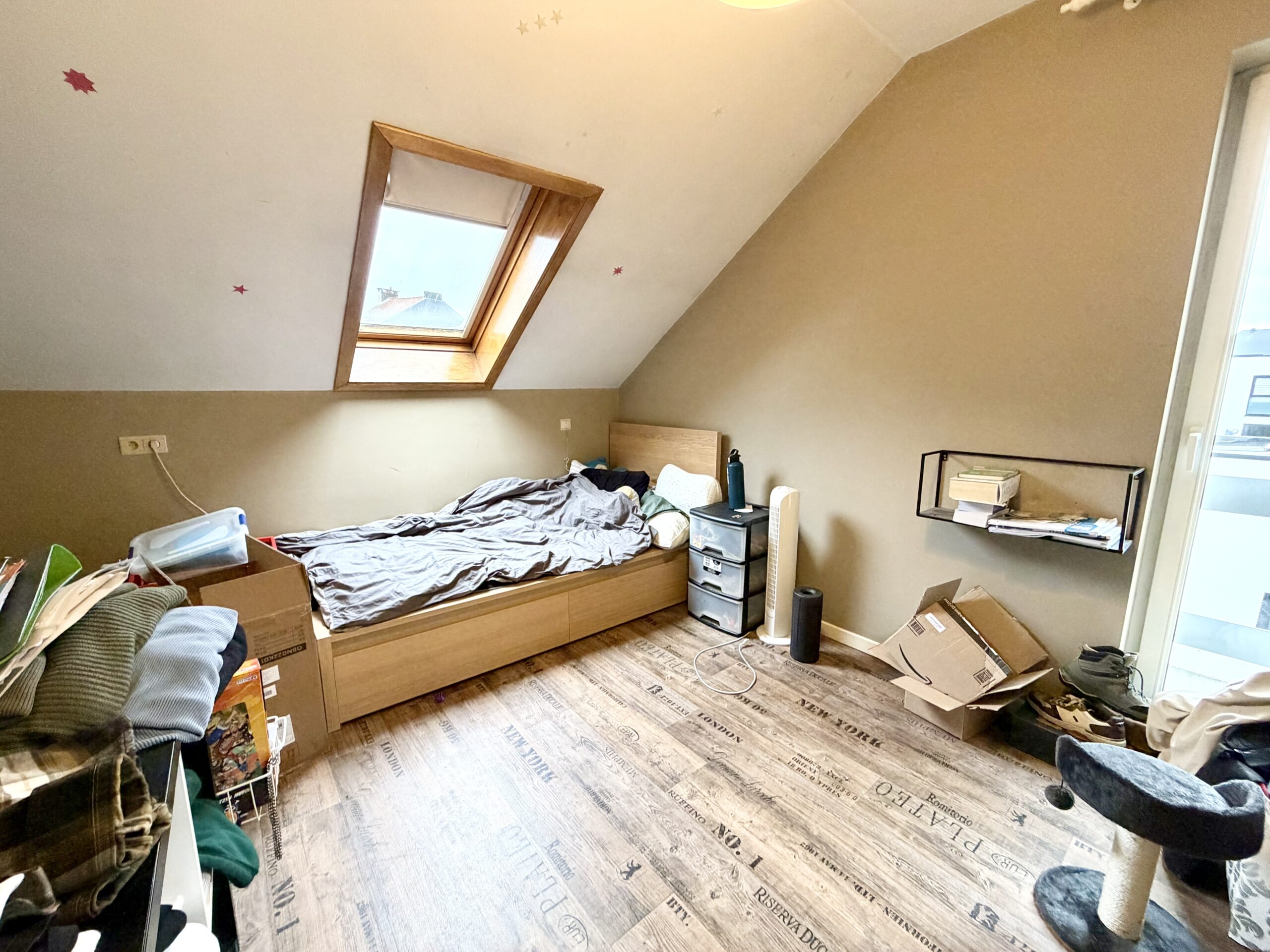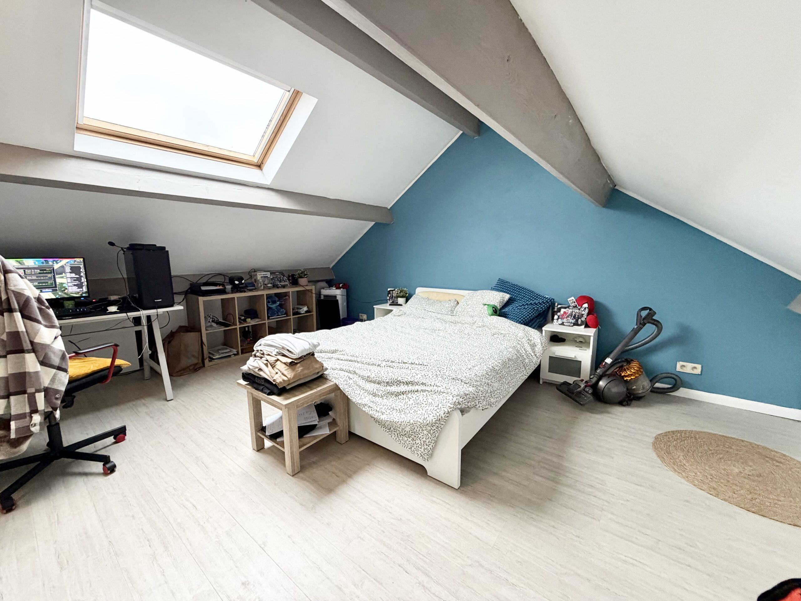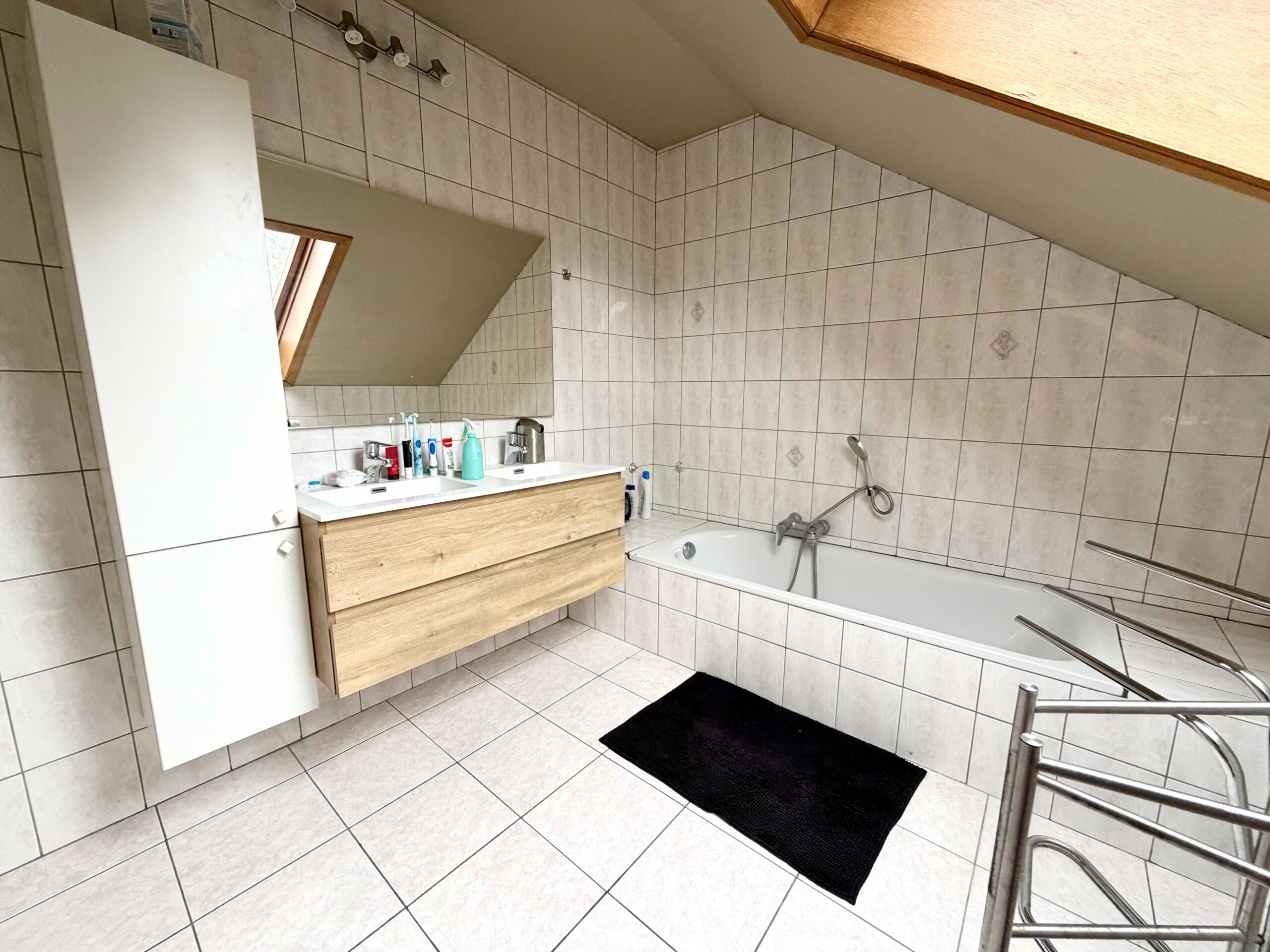 Hall d’entrée, bureau, WC séparé, salon, salle à manger, cuisine équipée, buanderie avec douche, garage, hall de nuit, 4 chambres, terrasse + jardin, passage latéral, châssis double vitrage PVC, chauffage central aux gaz de ville, panneaux photovoltaïques (21), 240 m² de superficie plancher chauffé d’après PEB, bail en cours.