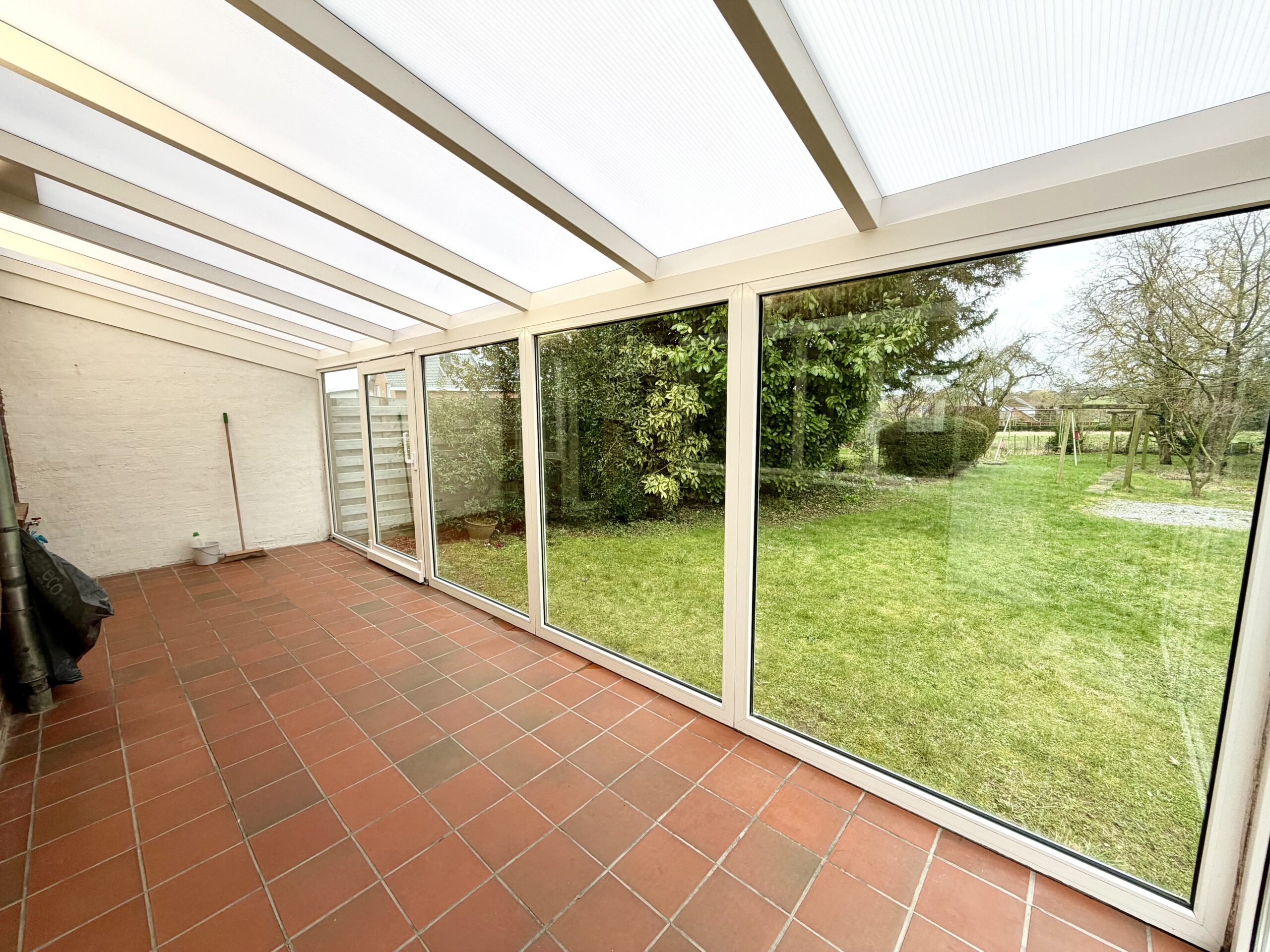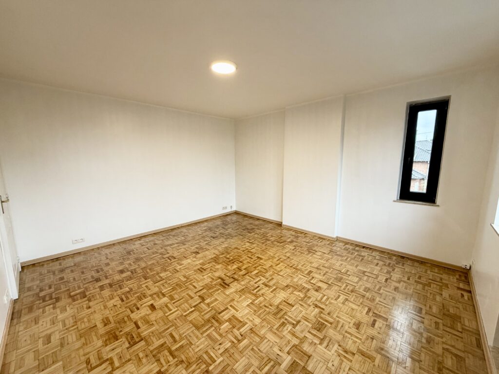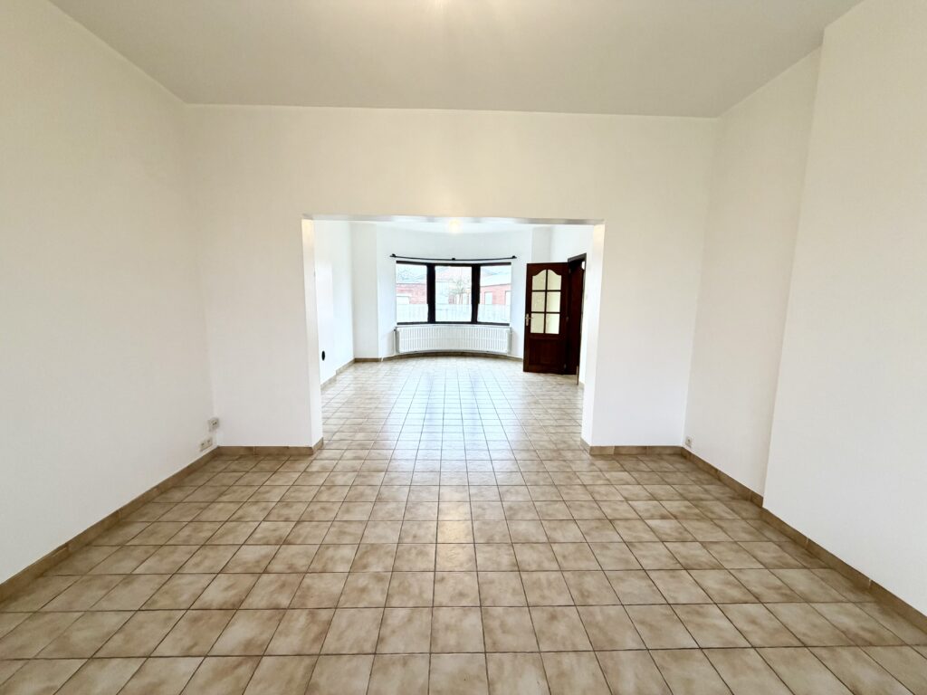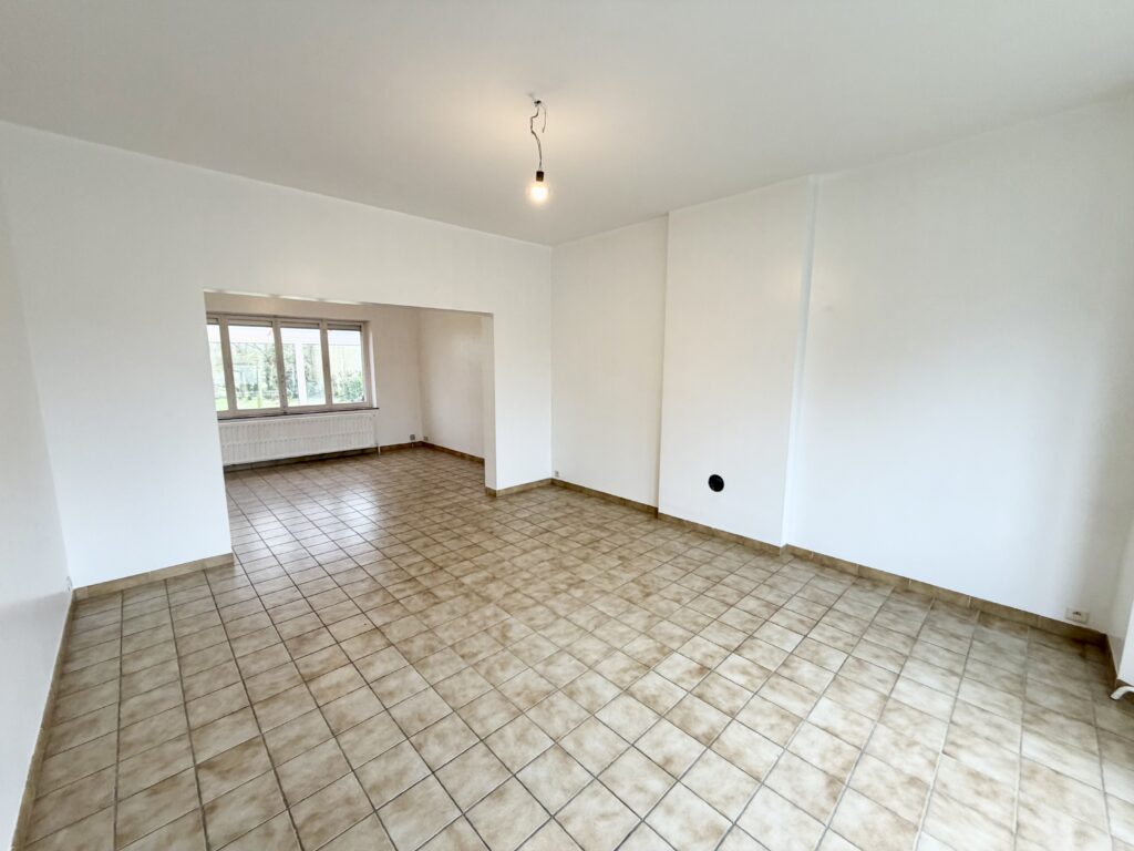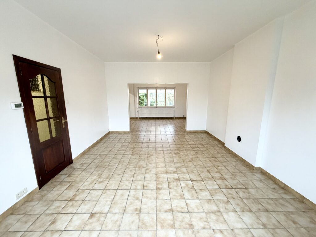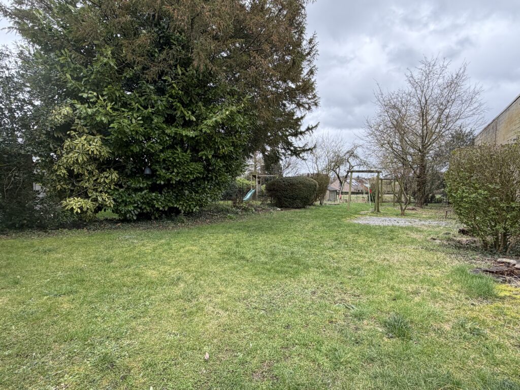 Hall d’entrée, salon, salle à manger, cuisine équipée, WC séparé, véranda, hall de nuit, 2 chambres, 1 bureau, salle de bain avec baignoire et lavabo, cave, jardin, garage, châssis double vitrage PVC et bois, chauffage central au mazout.