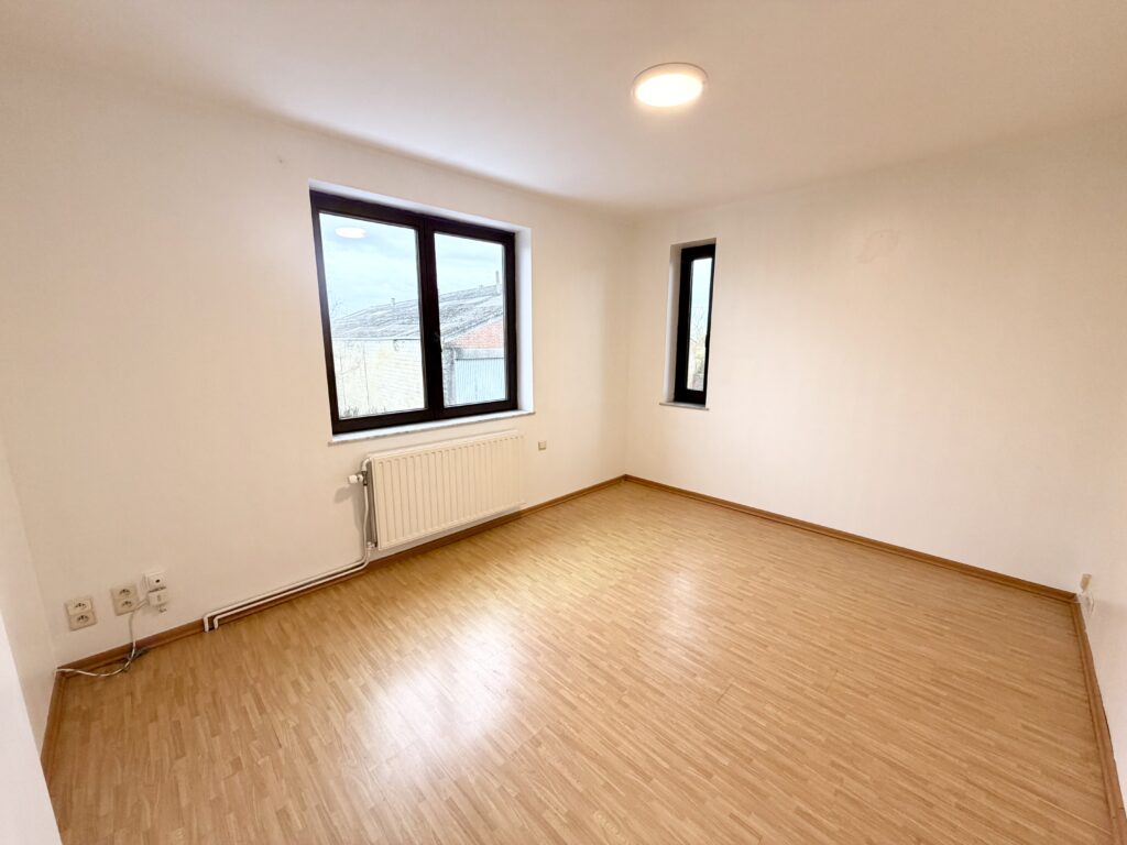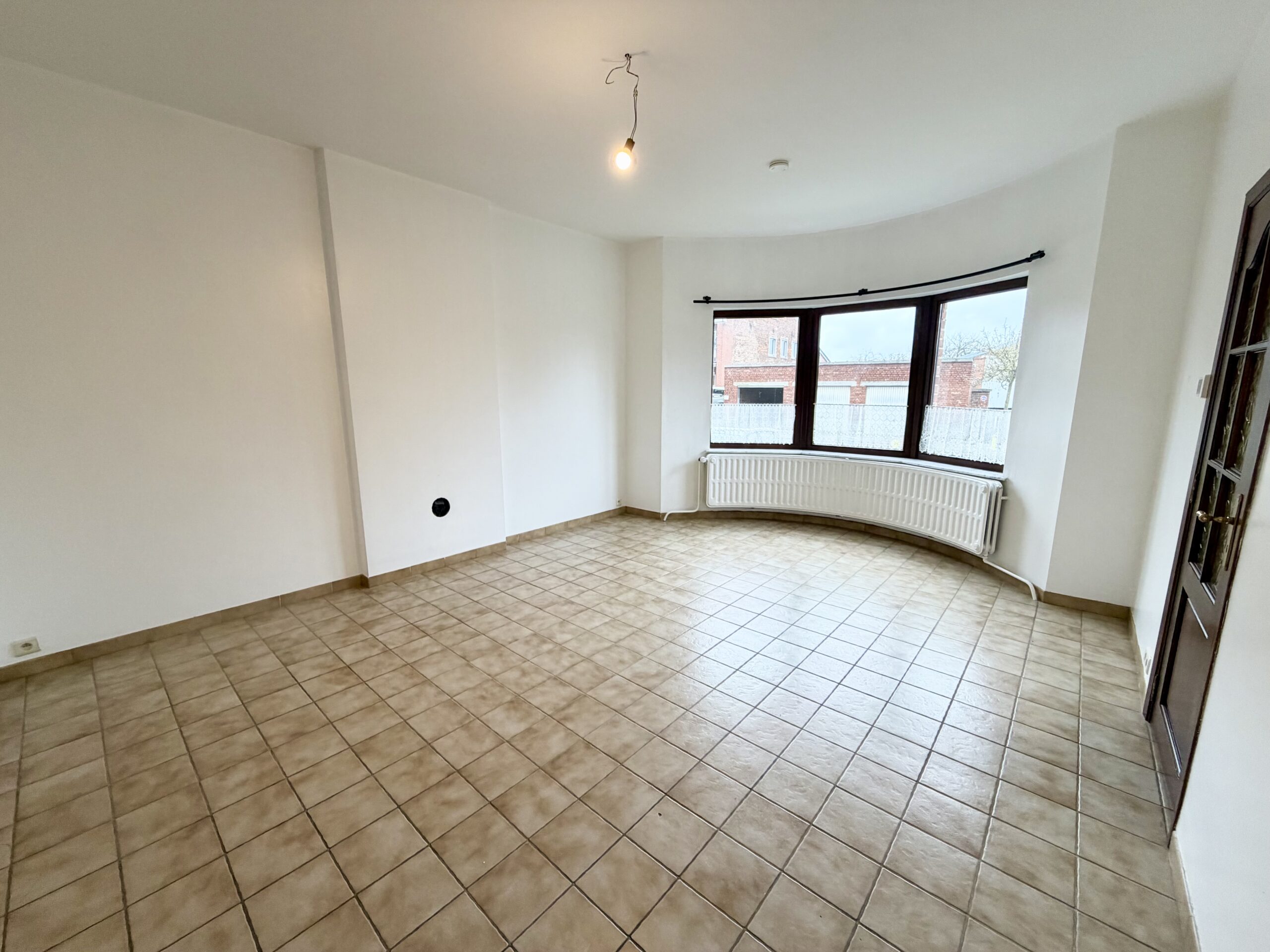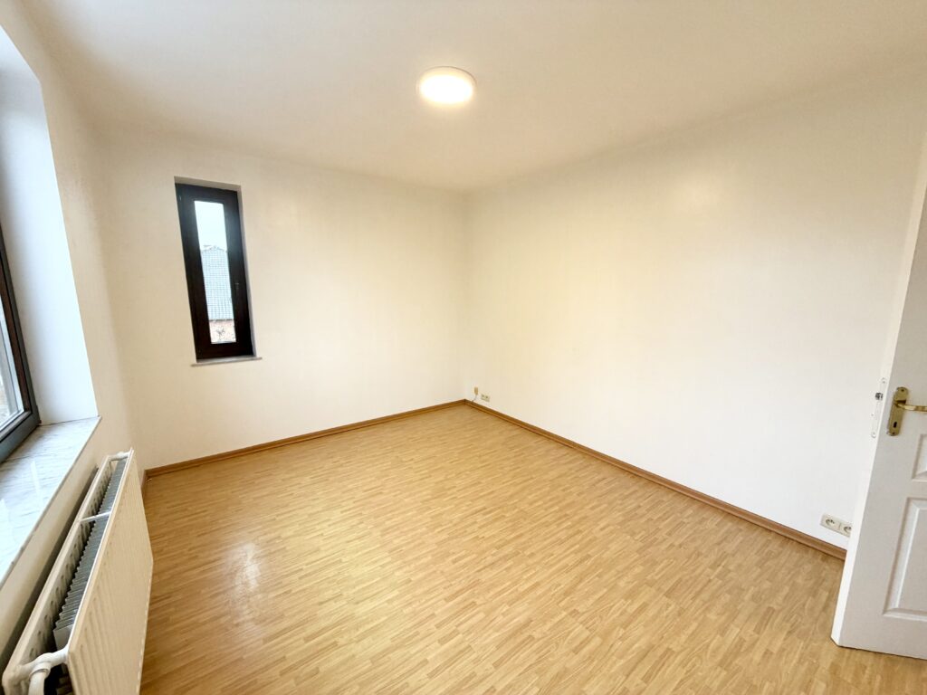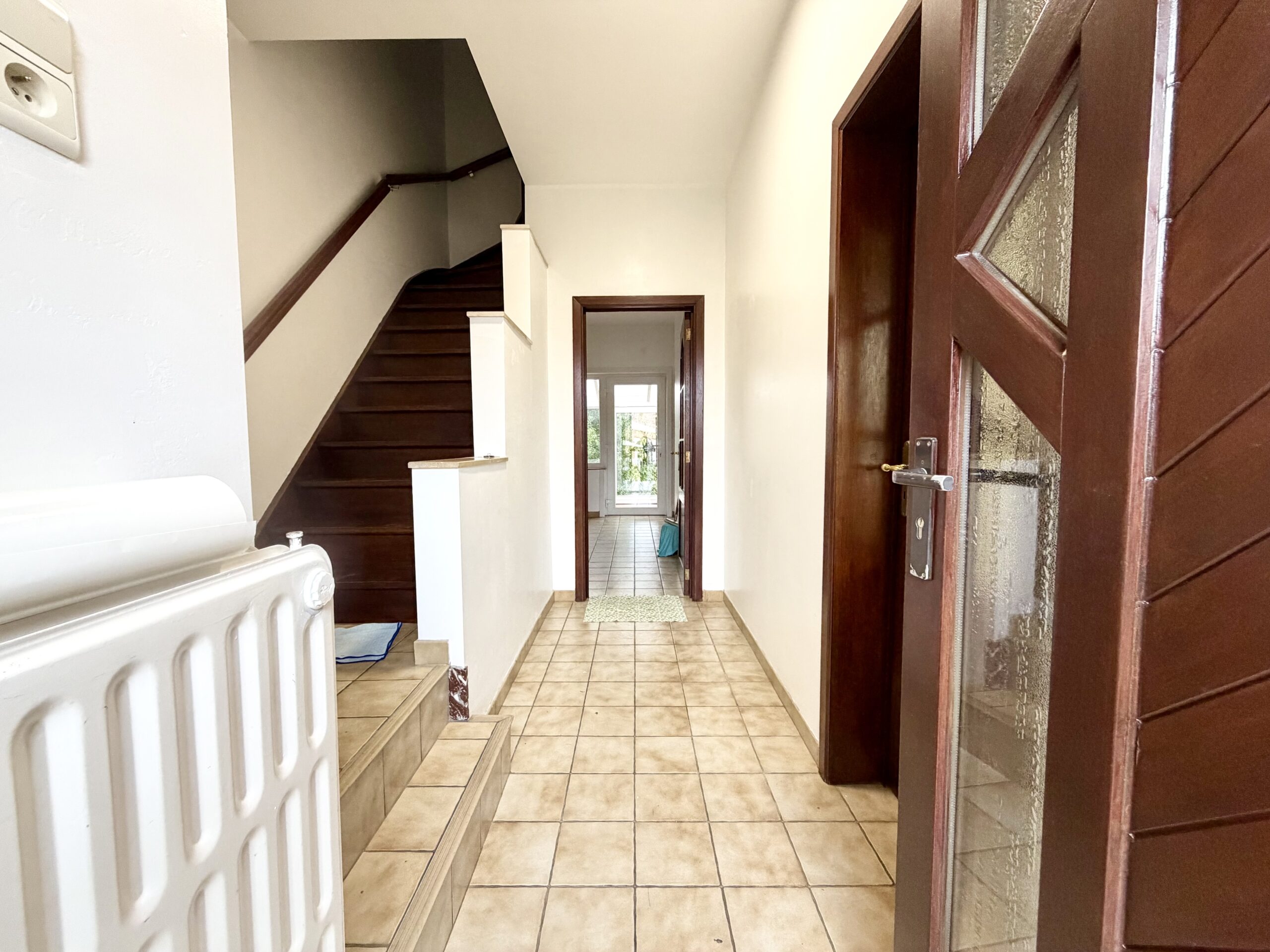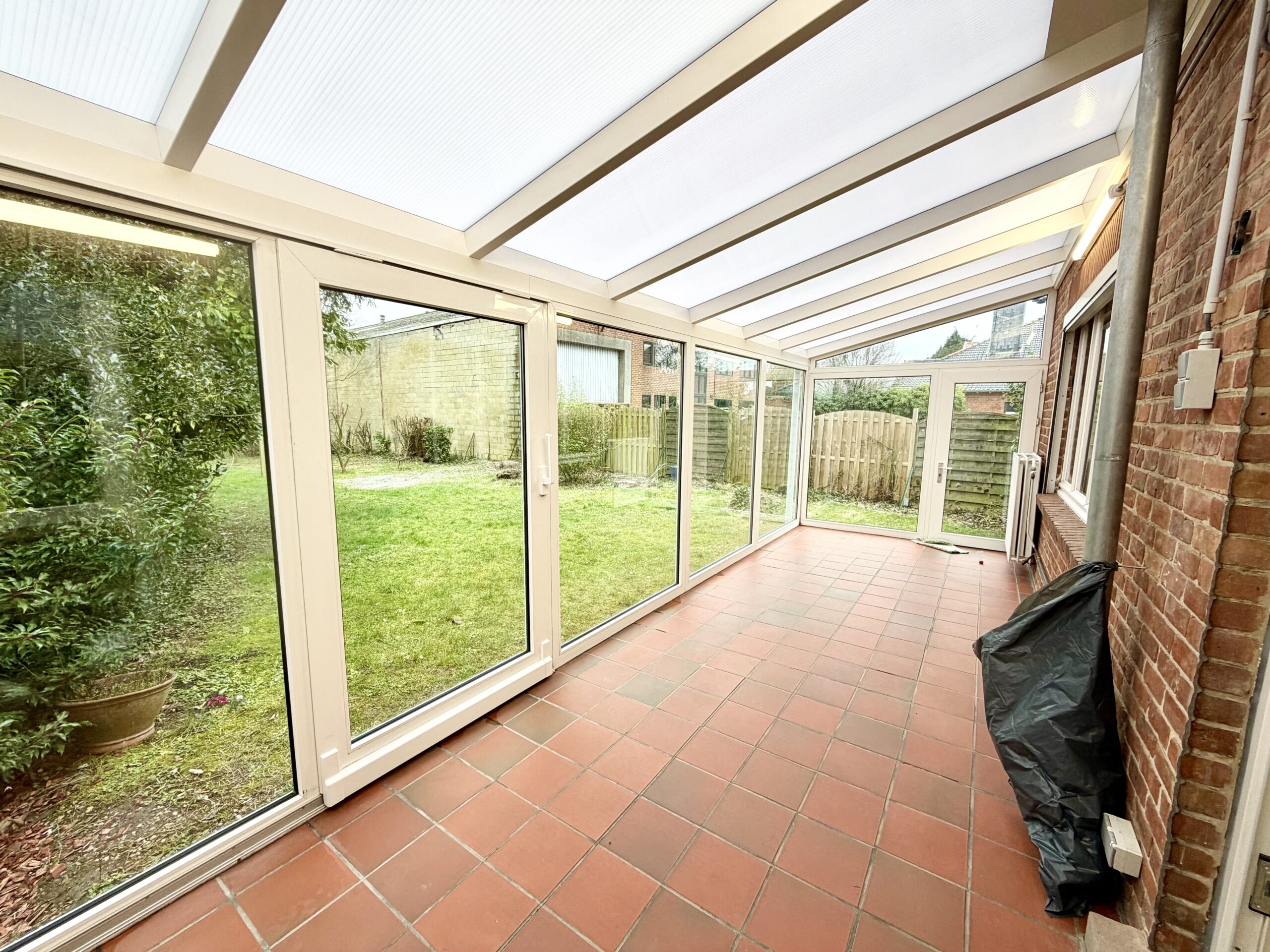 Hall d’entrée, salon, salle à manger, cuisine équipée, WC séparé, véranda, hall de nuit, 2 chambres, 1 bureau, salle de bain avec baignoire et lavabo, cave, jardin, garage, châssis double vitrage PVC et bois, chauffage central au mazout.